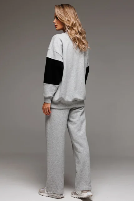 Джемпер с дизайнерскими, наклонными резами и на переде, и на спинке, выполненных из разных контрастных оттенков. Рукава визу имеют манжеты. Воротник-стойка, манжеты, низ джемпера выполнены из ткани-компаньена кошкорсе. На левом переде вышит логотип в цвет полоски. Брюки имеют современный крой и облегание, удобные карманы на передних половинка, притачной пояс и резинку внутри. Низ брюк присобран на резинку.