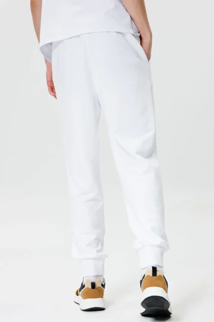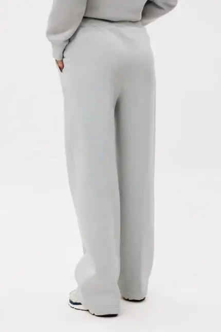 Бомбер прямого силуэта, с застежкой молнией из металла. Горловина, манжеты рукавов выполнены из ткани-компаньона кошкорсе. На левом переде вышивка-логотип в цвет ткани. Бомбер с кулисой по низу с резинкой внутри и фиксаторами на боковых швах. Брюки расширенные к низу, с возможностью заузить и зафиксировать ширину внизу (низ имеет кулиску с резинкой и фиксатором). На передних половинках брюк удобные накладные карманы, складки в районе линии колен. Пояс из ткани компаньена кошкорсе со шнуром и резинкой внутри.