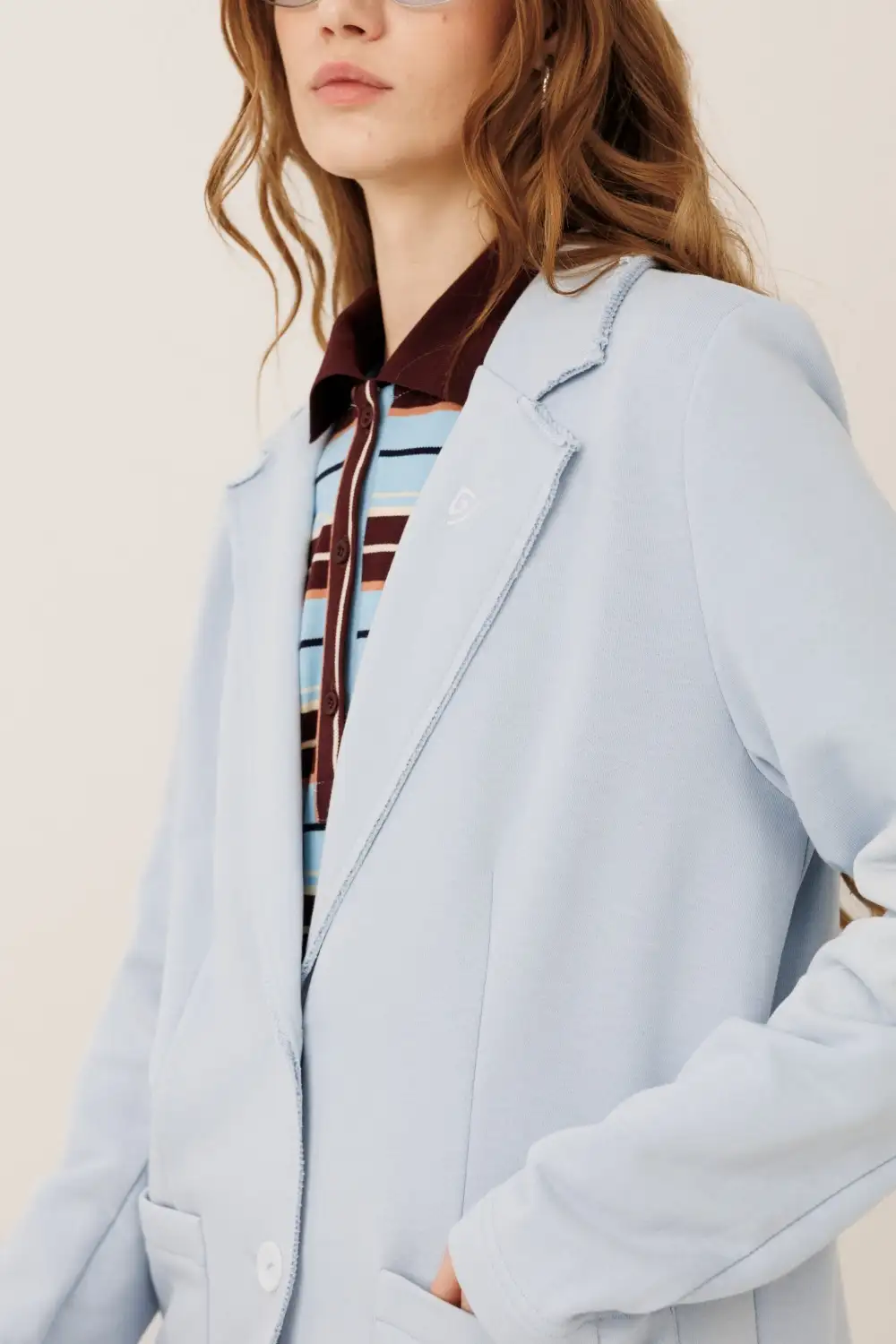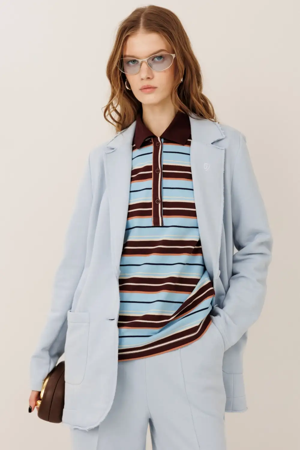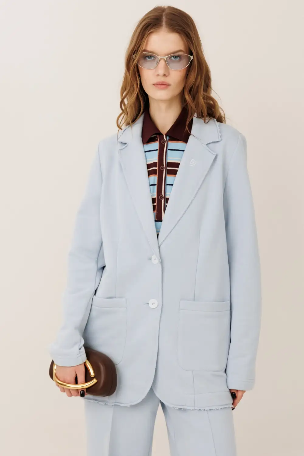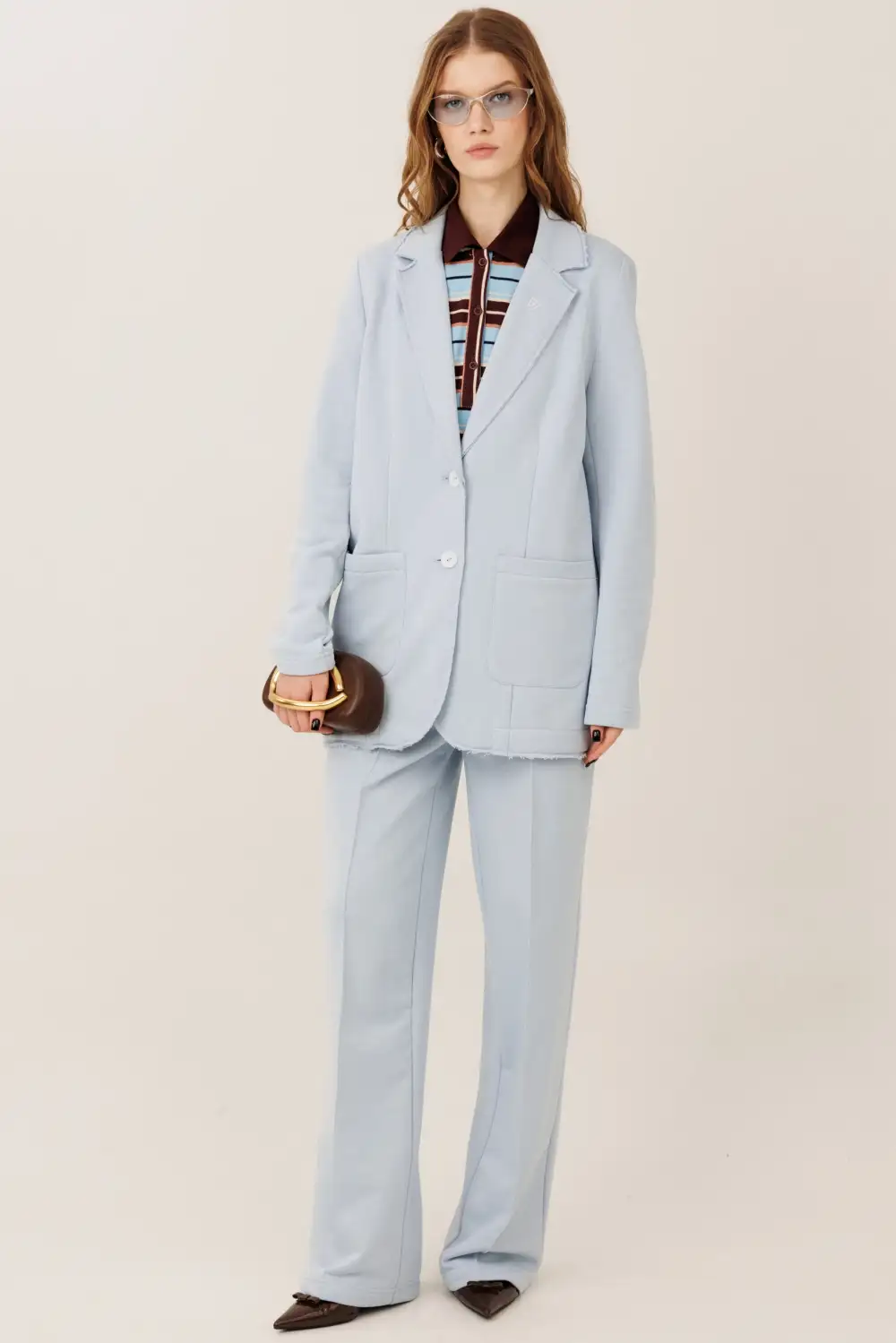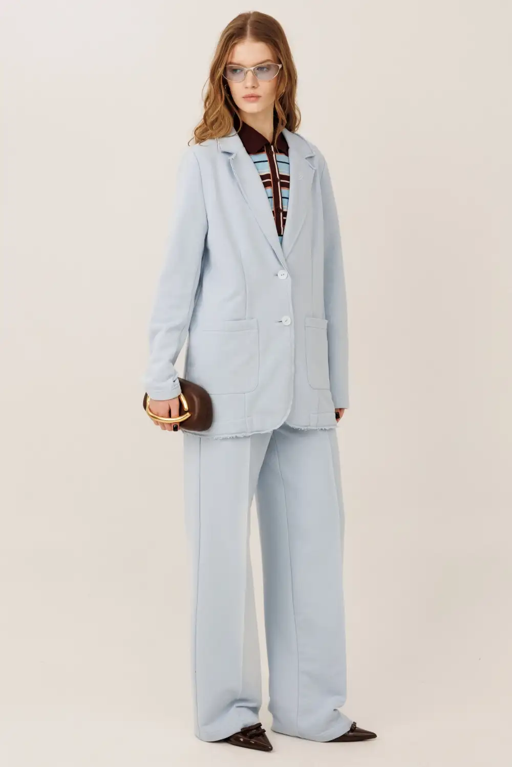 Костюм состоит из жакета и прямых брюк. Жакет прямого силуэта с воротником и лацканами, имеет удобные карманы и застежку на 2 пуговицы. На левом лацкане вышивка-логотип в контрастном цвете. Низ и борта имеют открытые края (эффект необработанного шва), укреплены дополнительной строчкой. Жакет без подкладки. Брюки прямые. На передних половинках — отделочная строчка по стрелкам и удобные боковые карманы. Пояс из ткани кошкорсе, с резинкой и контрастным шнурком.