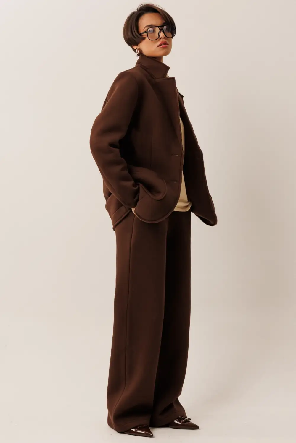 Жакет прямого силуэта с пиджачным воротником, имеет удобные накладные карманы и застежку на 2 пуговицы. На левом лацкане вышивка-логотип в цвет ткани. Низ и борта имеют открытые края (эффект необработанного шва), укреплены дополнительной строчкой. Жакет без подкладки.