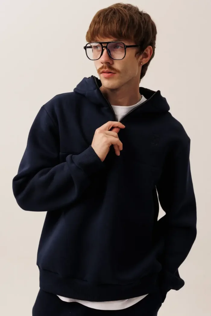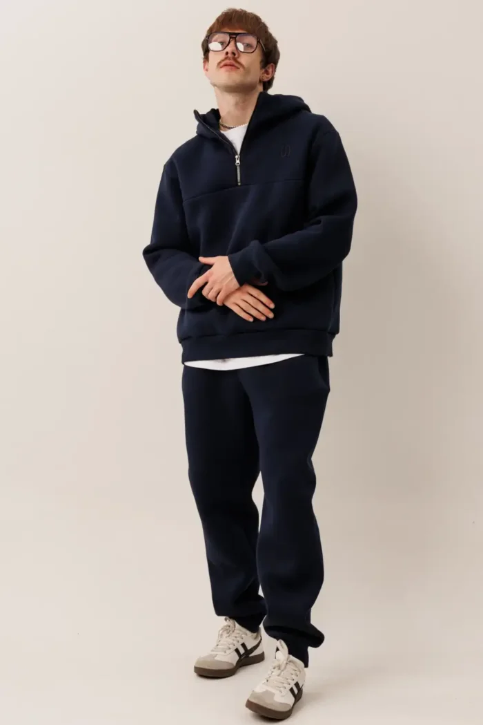 Костюм сделан из теплой, комфортной ткани. Состоит из джемпера и брюк. Джемпер имеет двойной капюшон и короткую застежку — молнию черного контрастного цвета по центру переда. На переде с левой стороны выполнена вышивка в цвет ткани, а также расположена горизонтальная кокетка. Джемпер имеет прямой силуэт. Низ джемпера и манжеты выполнены из кашкорсе. Брюки зауженные к низу с притачным поясом (резинка и шнурок внутри). Брюки с боковыми карманами. По низу брюк – манжеты.
