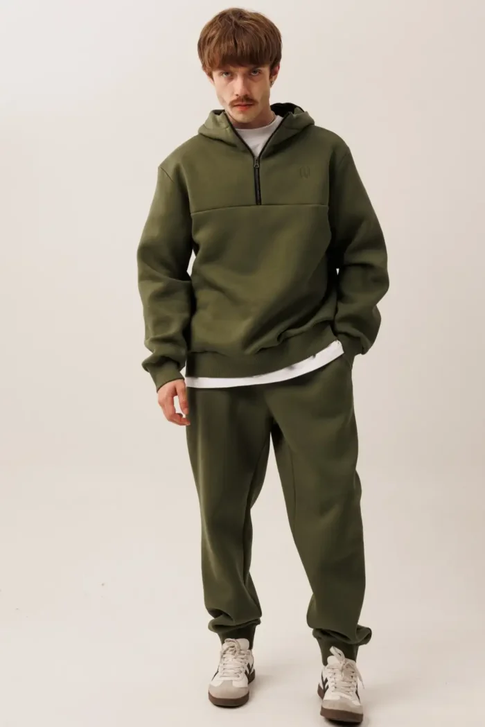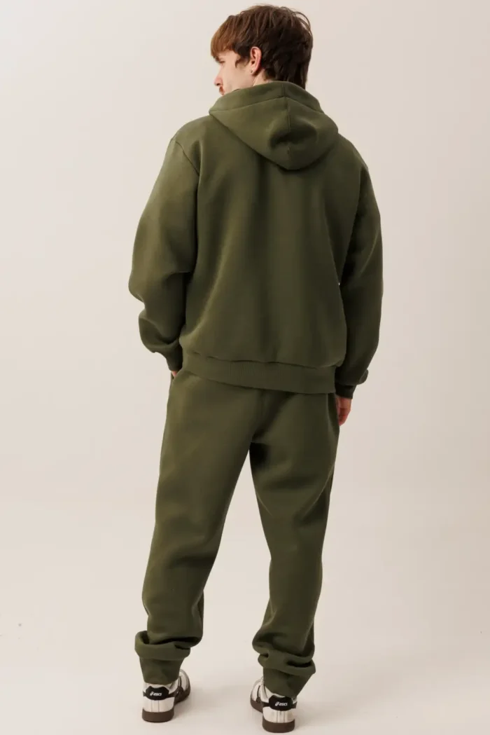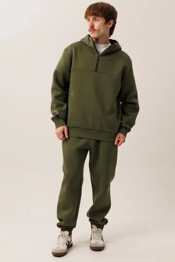 Костюм сделан из теплой, комфортной ткани. Состоит из джемпера и брюк. Джемпер имеет двойной капюшон и короткую застежку — молнию черного контрастного цвета по центру переда. На переде с левой стороны выполнена вышивка в цвет ткани, а также расположена горизонтальная кокетка. Джемпер имеет прямой силуэт. Низ джемпера и манжеты выполнены из кашкорсе. Брюки зауженные к низу с притачным поясом (резинка и шнурок внутри). Брюки с боковыми карманами. По низу брюк – манжеты.