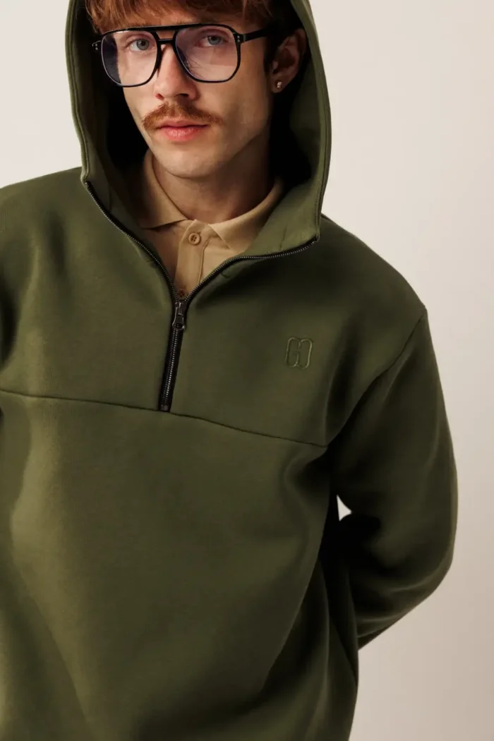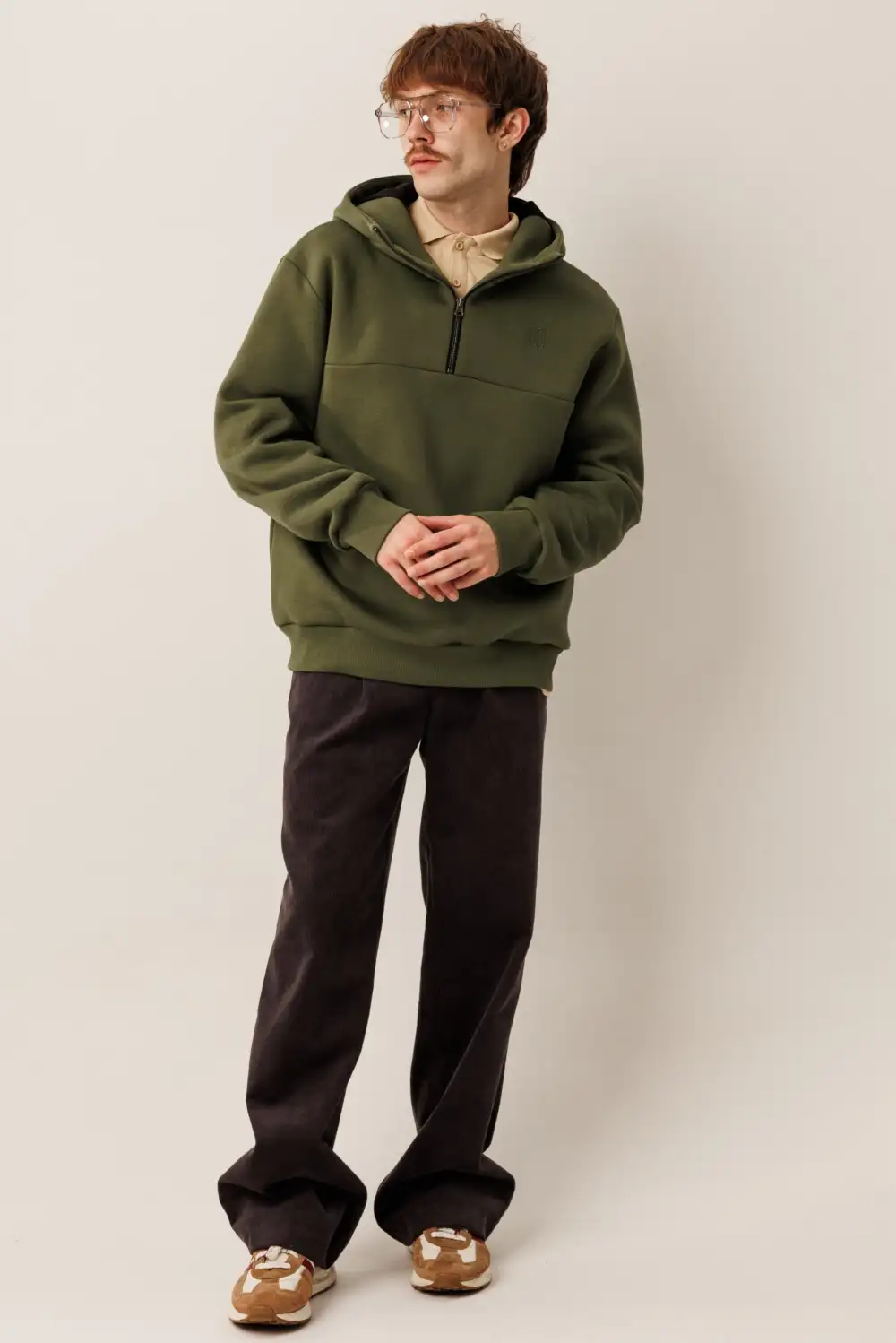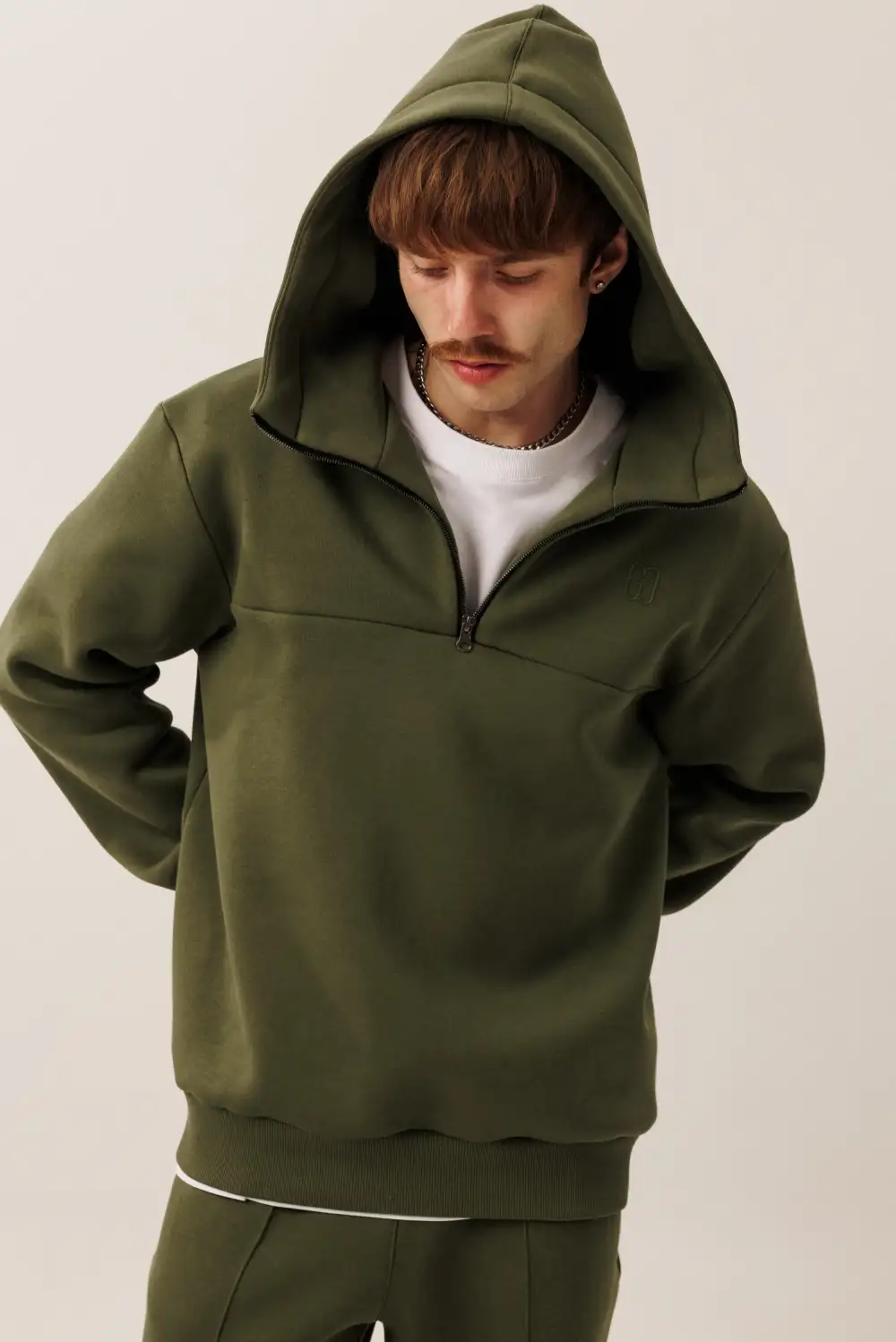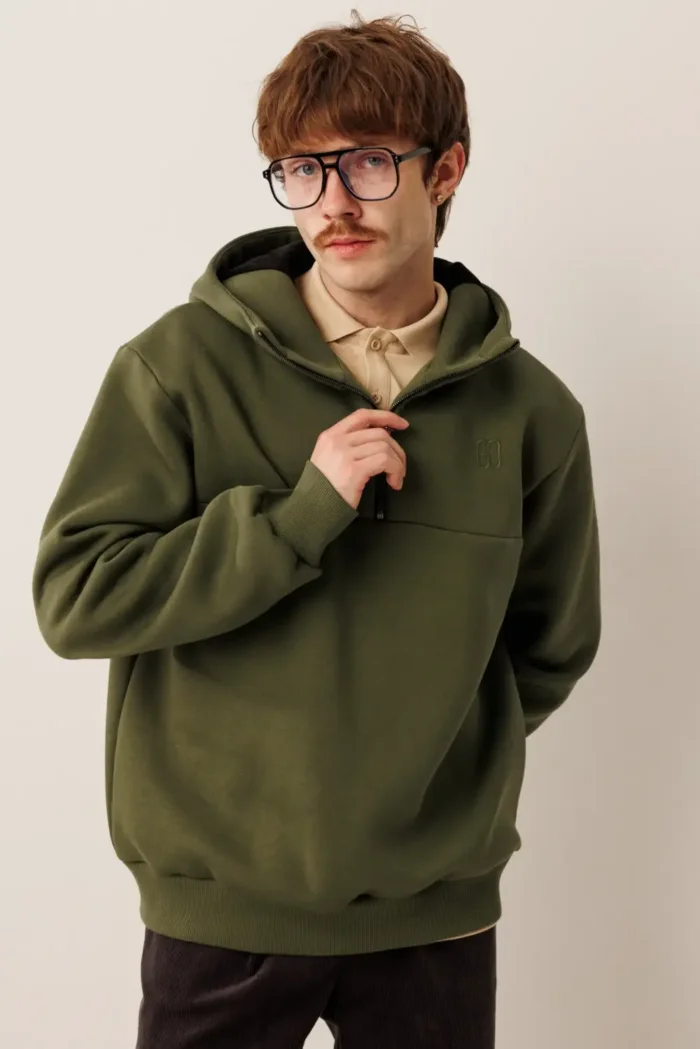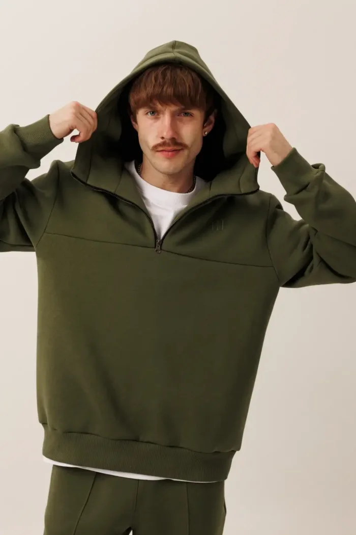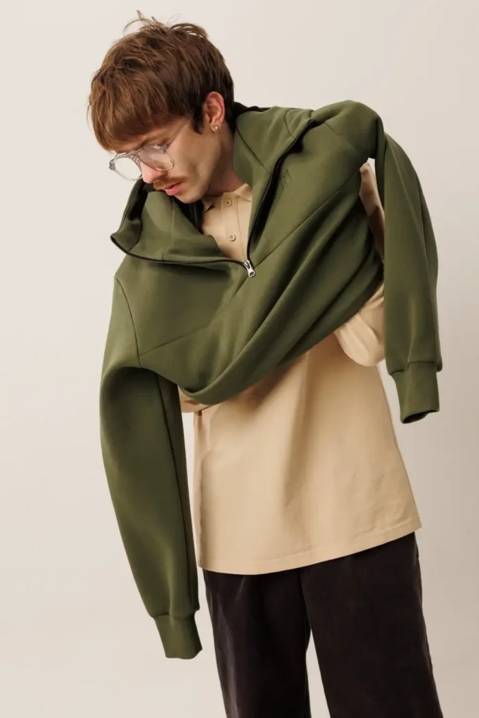 Джемпер имеет двойной капюшон и короткую застежку — молнию черного контрастного цвета по центру переда. На переде с левой стороны выполнена вышивка в цвет ткани, а также расположена горизонтальная кокетка. Джемпер имеет прямой силуэт.